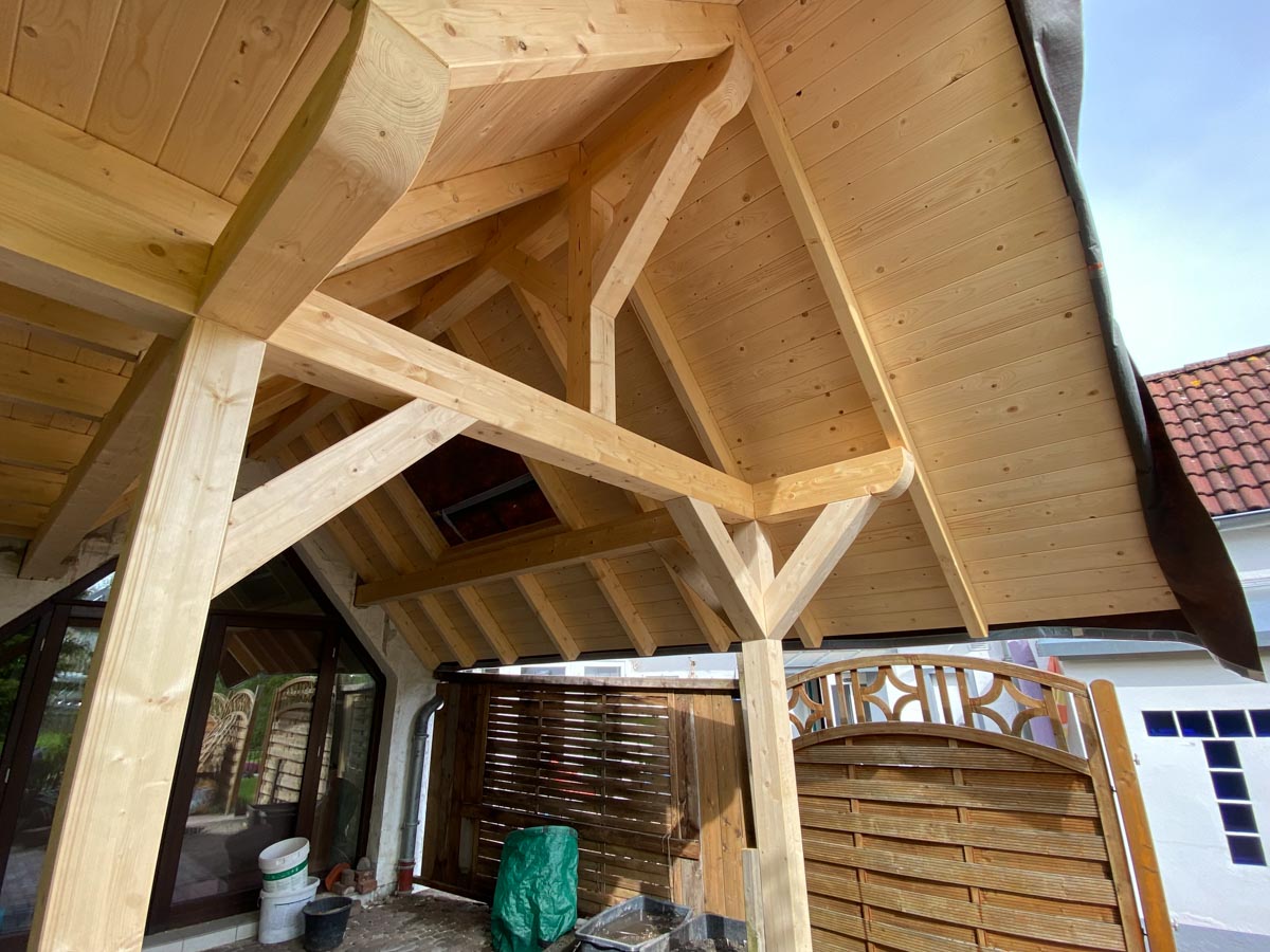 Bau einer individuellen Terrassenüberdachung aus Holz in Verbindung der Dachform des Wohngebäudes. Die Terrassenüberdachung wurde mit zwei Satteldächern und dazwischen liegendem Flachdach gebaut. Für die Belichtung sorgen zwei Dachflächenfenster.